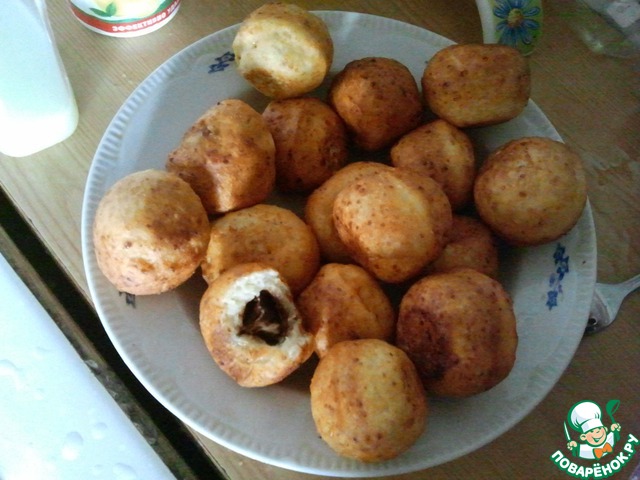 От теста мокрыми руками отрываем кусочки размером с грецкий орех, скатываем шарики, расплющиваем их в лепешку на ладони и кладем в центр кусочек шоколадного батончика, опять скатать шарик. Опускать шарики в большое количество кипящего растительного масла и жарить да золотисто-коричневого цвета. Доставать на салфетку шумовкой и подождать, пока стечет лишний жир.