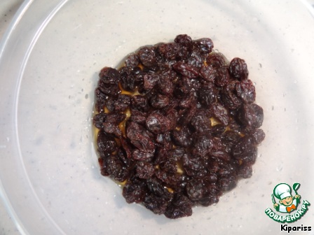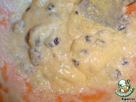 Цедру апельсина и лимона натереть на мелкой терке, смешать с желтками, размягченным сливочным маслом, 70 г сахара и изюмом (вместе с вином).