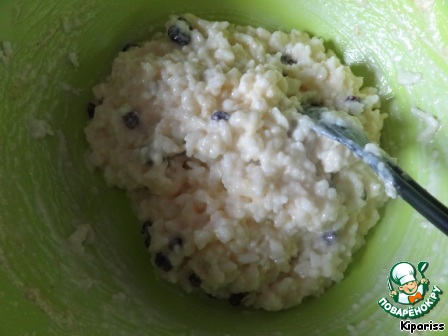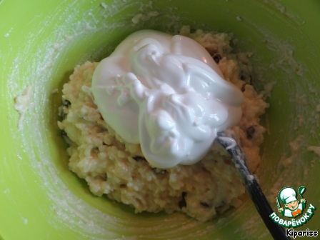 Белки взбить в крепкую пену, смешать с оставшимся сахаром и мукой. И осторожно добавить в рис.