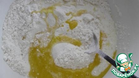 Добавить в сухую смесь взбитое яйцо, 30 миллилитров масла, молоко.