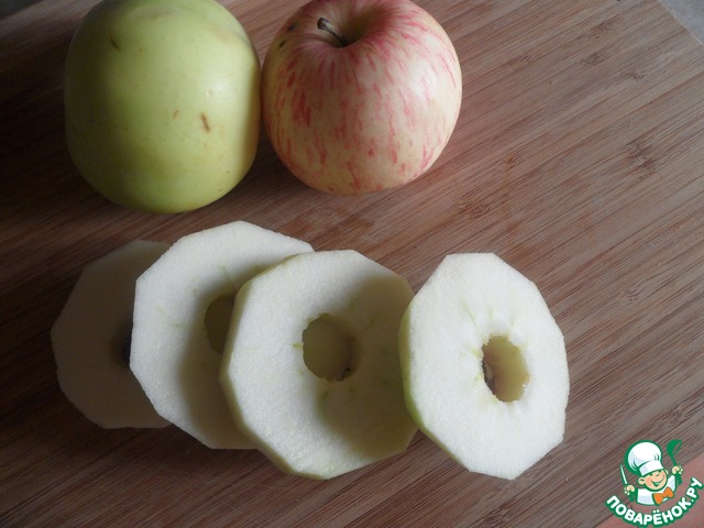 Яблоки очистить от кожуры, аккуратно специальным приспособлением вынуть середину, мякоть нарезать кольцами толщиной 1,5 см.