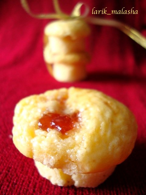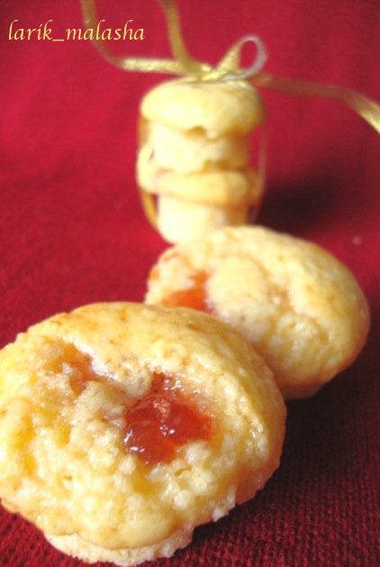 Сделать пальцем отверстие в центре булочек, положить немного варенья. Закрыть отверстие тестом.
