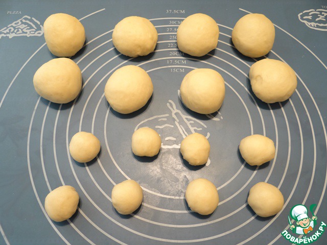 Тесто делим на 8 кусочков по 12 грамм, оставшееся тесто делим на 8 равных частей. Формуем из всех кусочков теста шары.