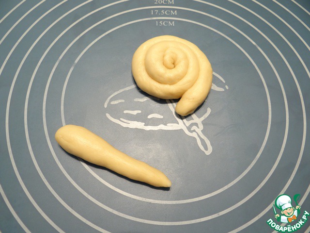 Из маленького кусочка теста формуем жгут, с одной стороны которого тесто должно быть потолще, по форме тесто должно напоминать конус.