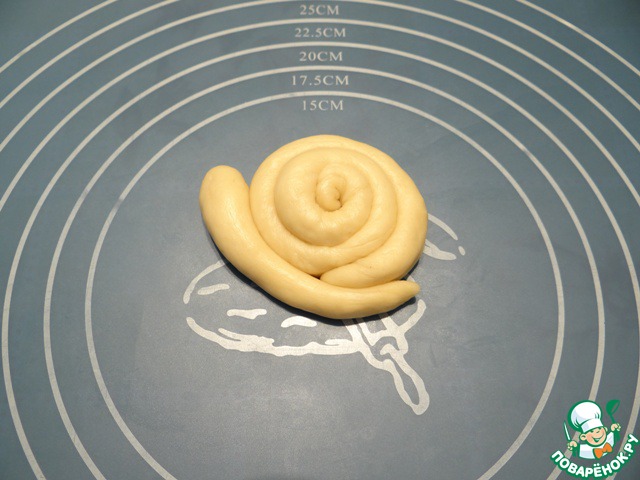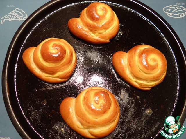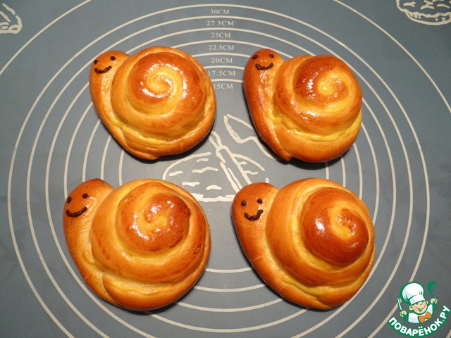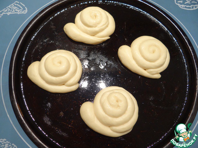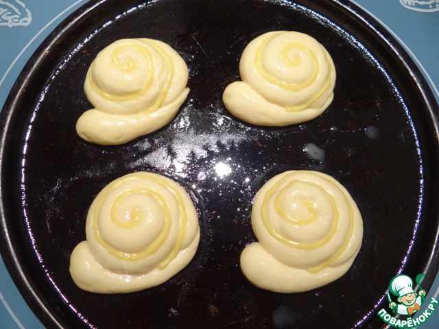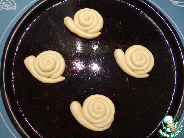 Аккуратно переносим "улитку" на противень, смазанный растительным маслом. Я выпекала "улитки" на 2-х противнях.
