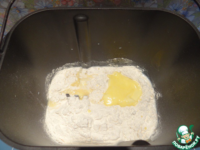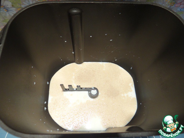 Дрожжевое тесто я замешиваю с помощью хлебопечки, но можно тесто замесить и обычным способом. В ведерко хлебопечки наливаем теплое молоко, добавляем дрожжи и оставляем минут на 5-10.