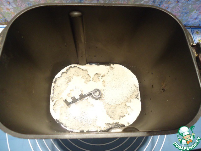 Я замешиваю тесто в хлебопечке. Если у Вас нет ее, ничего страшного - тесто можно замесить руками. Сначала готовим тесто №1 - в теплую воду добавляем дрожжи. Оставляем минут на пять.