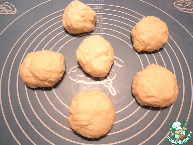 Затем тесто уминаем и делим на 6 равных частей. Накрываем пленкой, чтобы тесто не засохло, оставляем минут на 15.