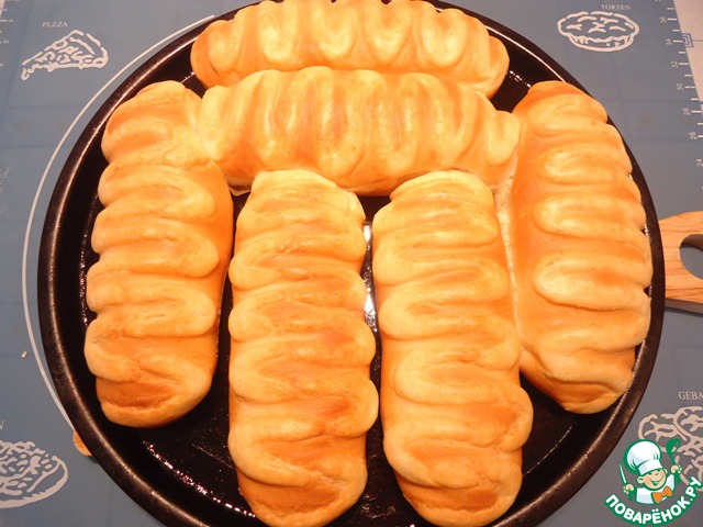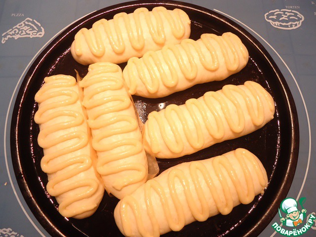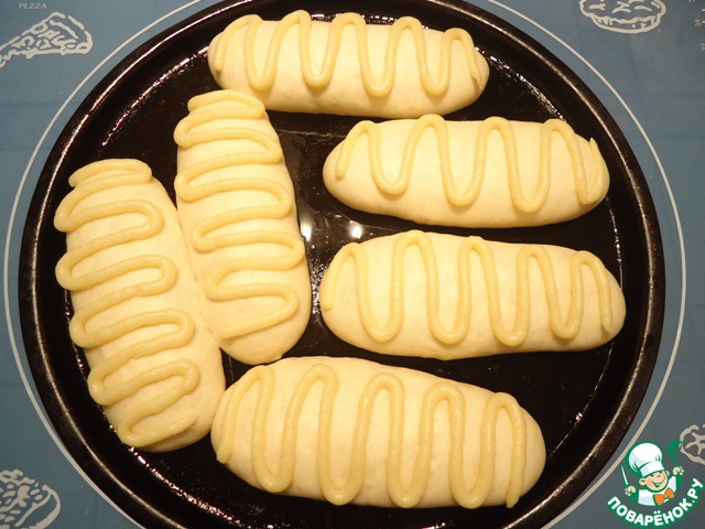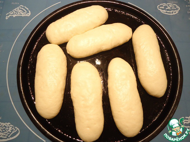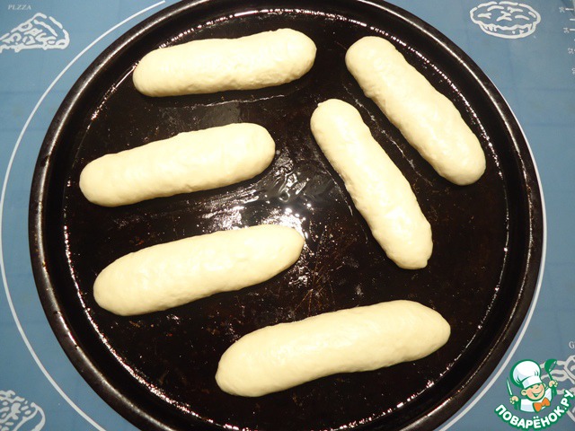 Форму для выпечки смазать растительным маслом, уложить булочки на противень швом вниз. Накрыть заготовки пленкой.