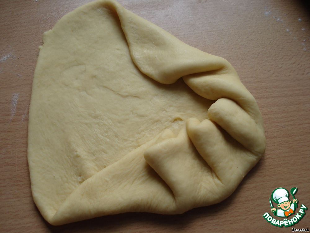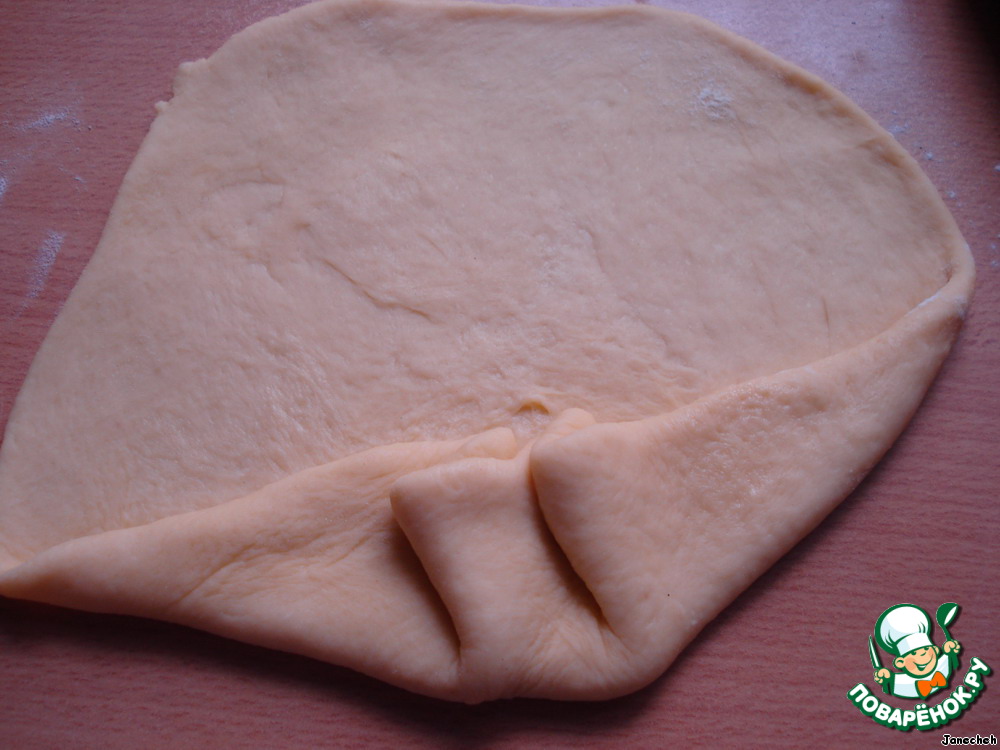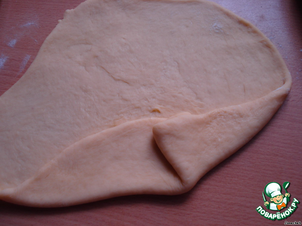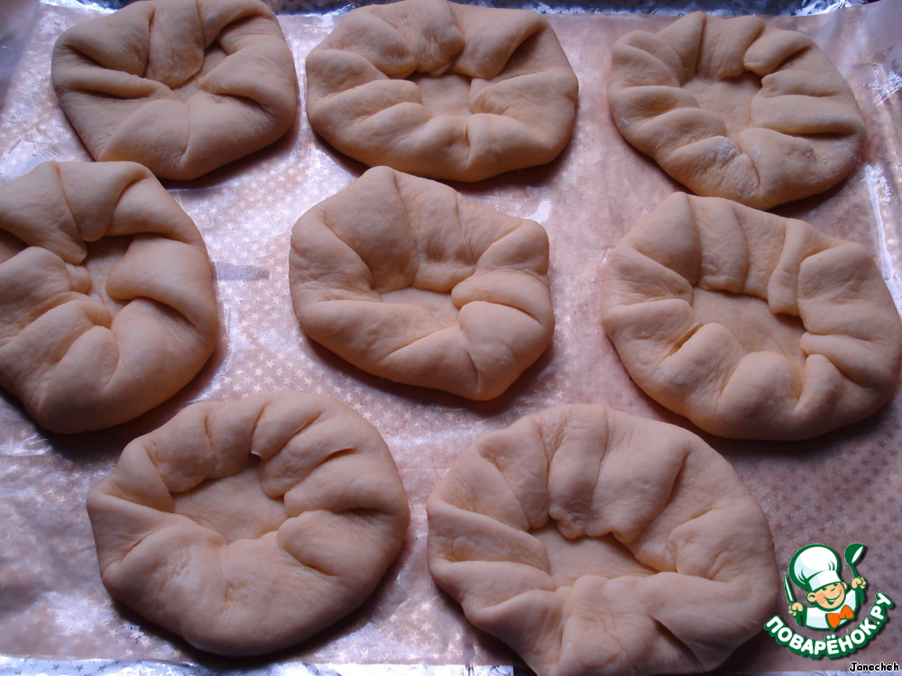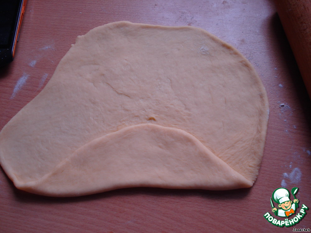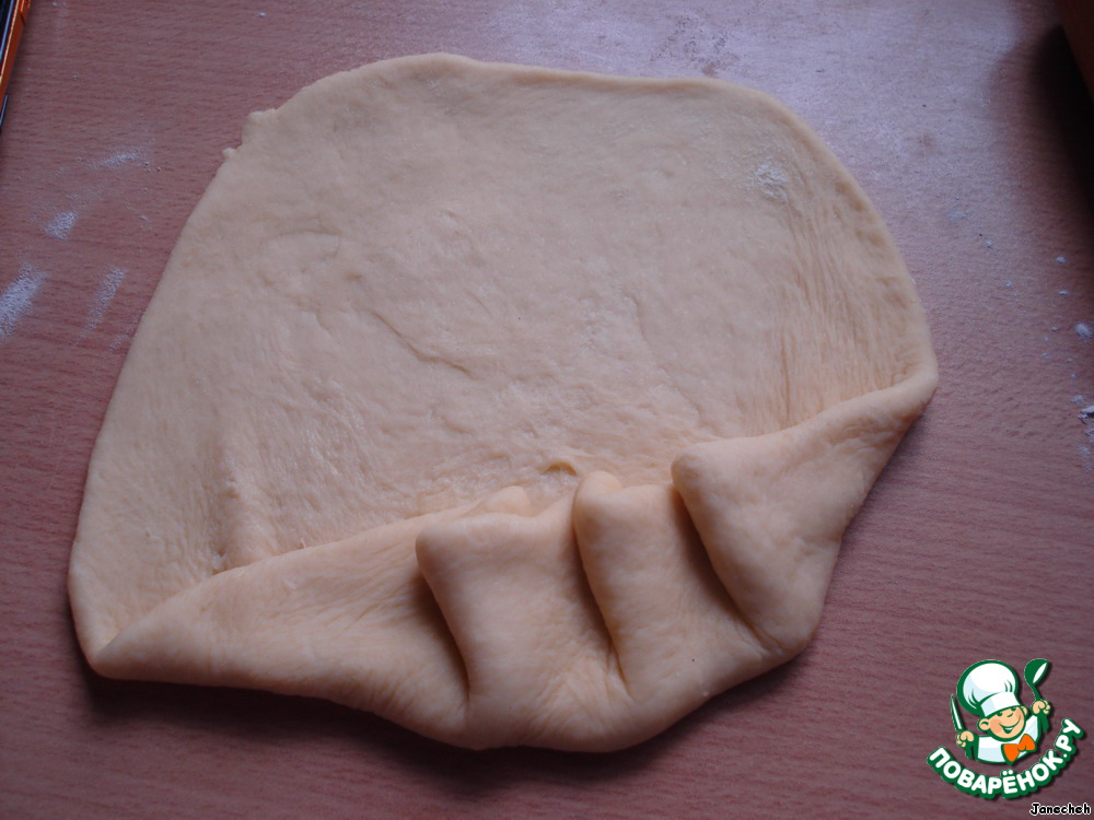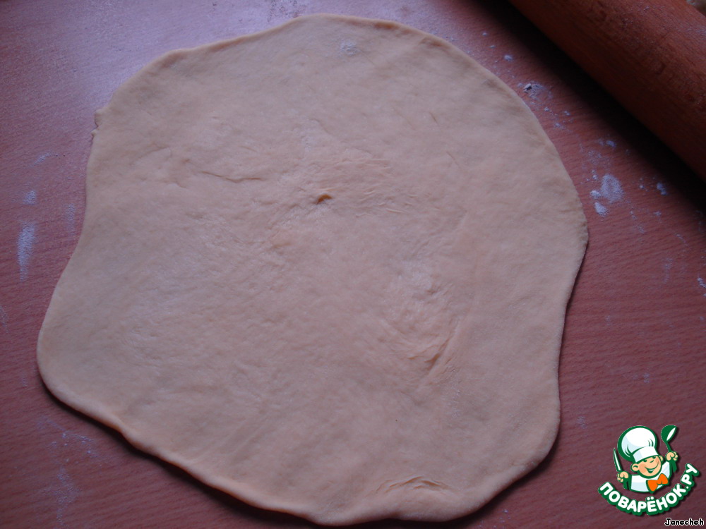 Из каждой части раскатываем тонкую лепешку (можно подпылить немножко мукой).