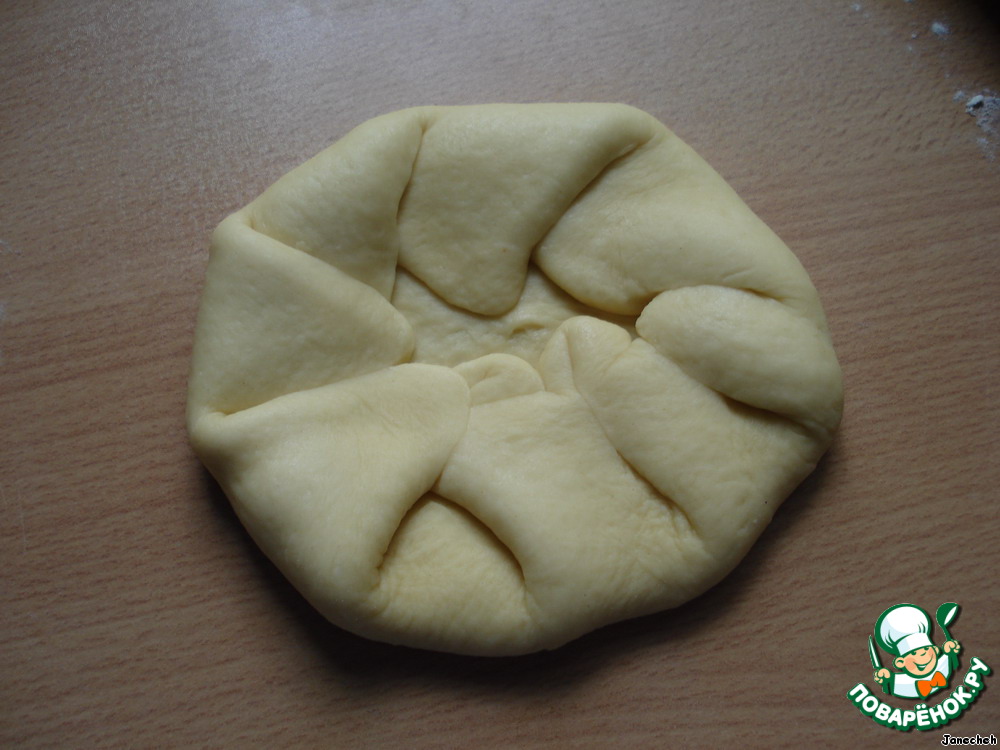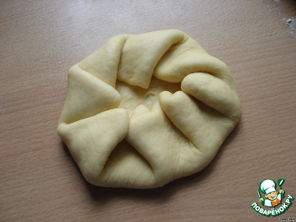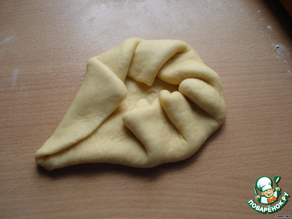 А когда завернули розанчик, нужно придавливать ладонью всю булочку и немного пальцами примять края в середине.