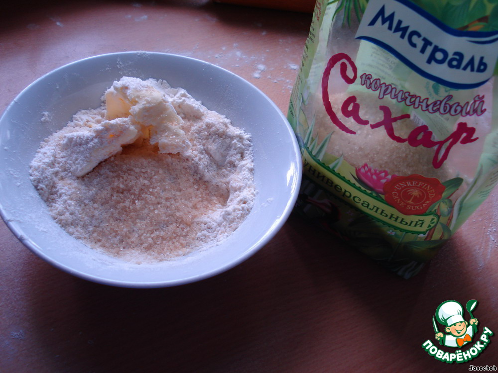 Муку перетереть с сахаром и маслом до получения крошек.