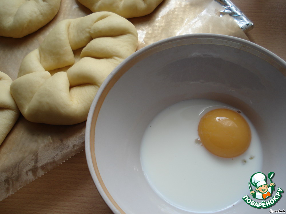 Размешаем 1 желток и 2 столовые ложки молока и смажем подошедшие булочки.