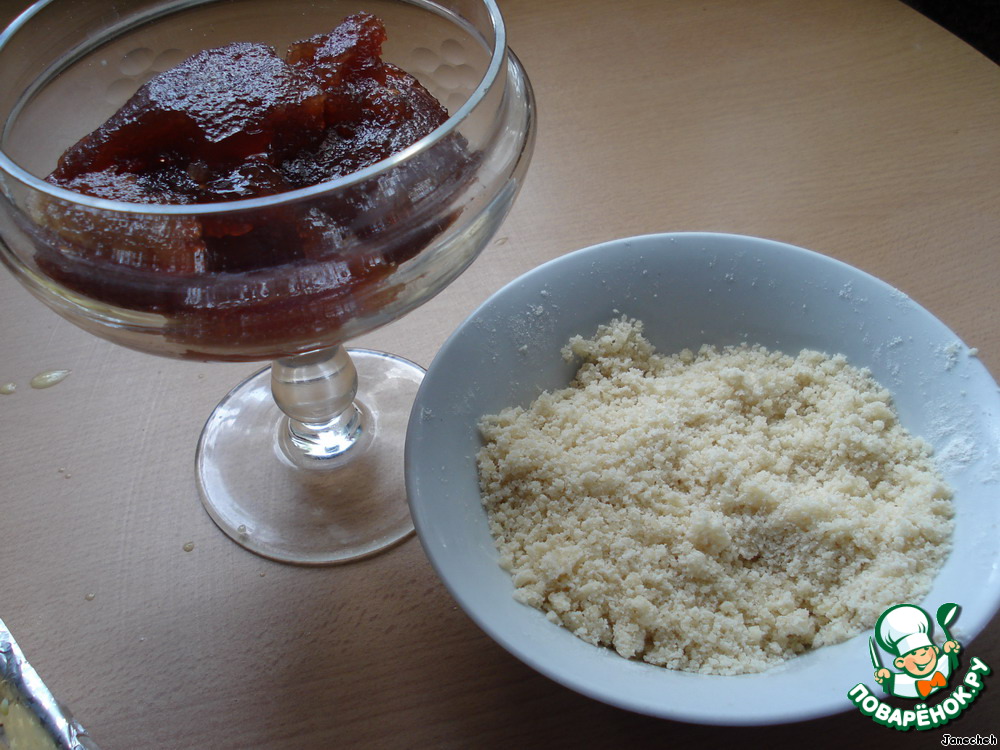 В середину кладем по 1 столовой ложке повидла. Посыпаем штрейзелем.