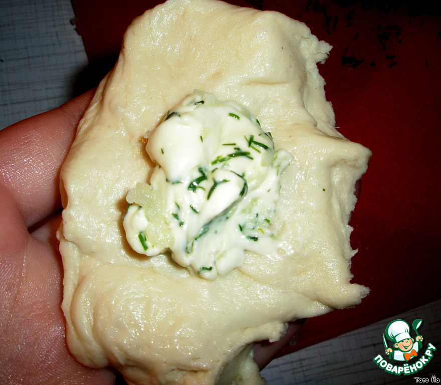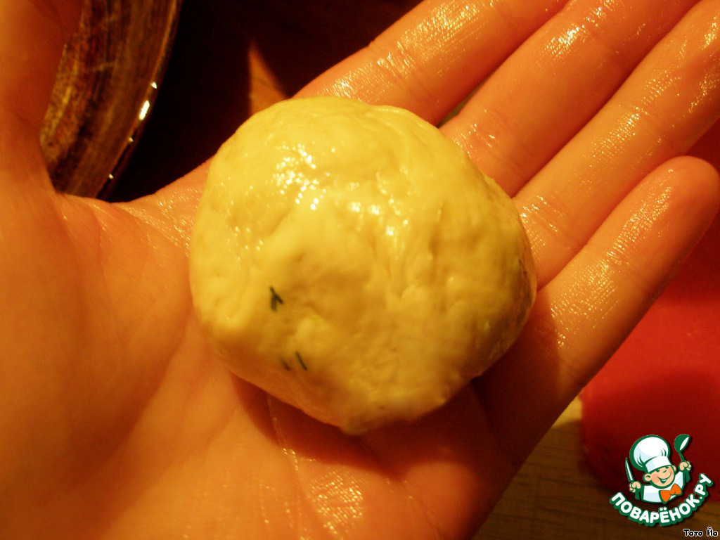 Отщипываем кусочек теста, чуть расплющиваем на руке. В центр кладём чуть начинки.