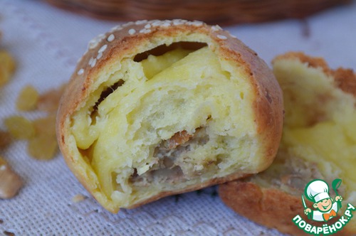 Не хотите заморачиваться? Сделайте из теста лепешку и в середину положите начинку. Но мне понравилось делать в виде рулета – так начинка равномерно распределена по всей булочке.
