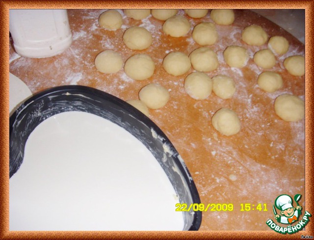 и поместить в форму плотненько друг к другу. Мои шарики были по 40 гр, но можно и меньше. [b]Мой совет.[/b] Сливки можно(нужно,так и просятся) удвоить,но...форму берите поглубже,чтобы при выпекании сливки не вышли из формы.