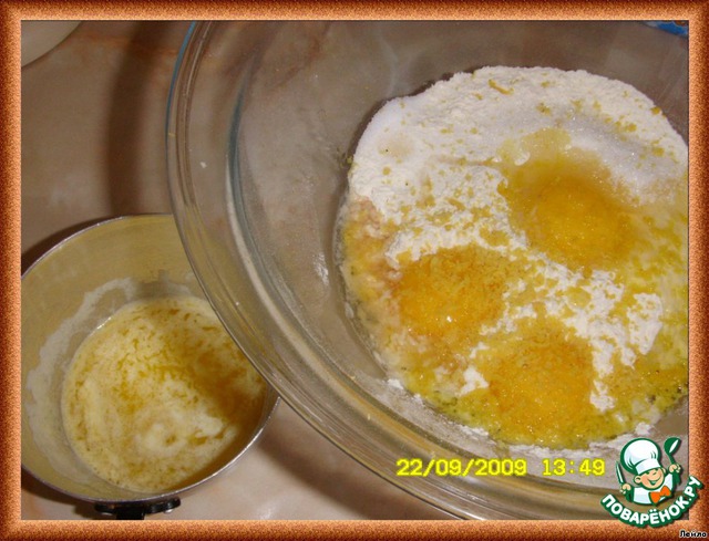 В большую миску сложить 200 гр муки, растопленное и немножко остывшее масло, желтки,яйцо, 20 гр сахара, щепотку соли, цедру, ром и ванильный сахар