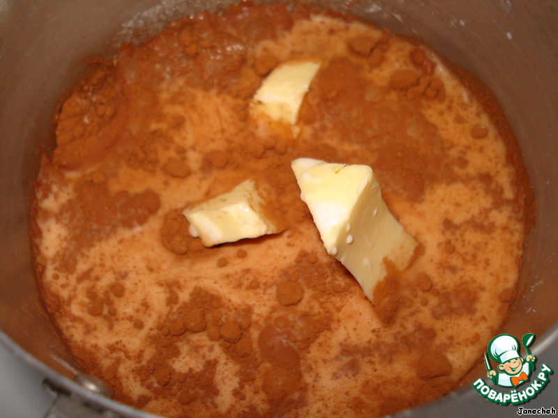 Поставить на маленький огонь, постоянно помешивая, варить до загустения, до бульков. Наш шоколадный крем готов.