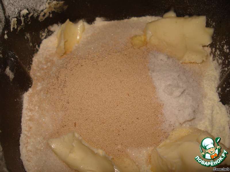 Тесто я доверила хлебопечке, но можно и вручную. Из указанных продуктов замесить мягкое тесто (смешать дрожжи с мукой, добавить сахар, яйцо, воду, сухое молоко, сливочное масло размягченное и соль), поставить подходить в теплое место до увеличения теста в 2 раза.