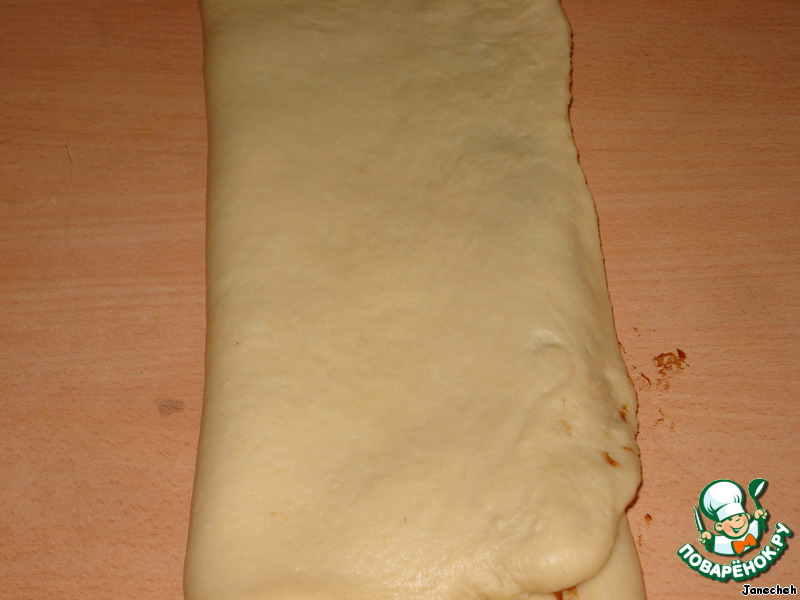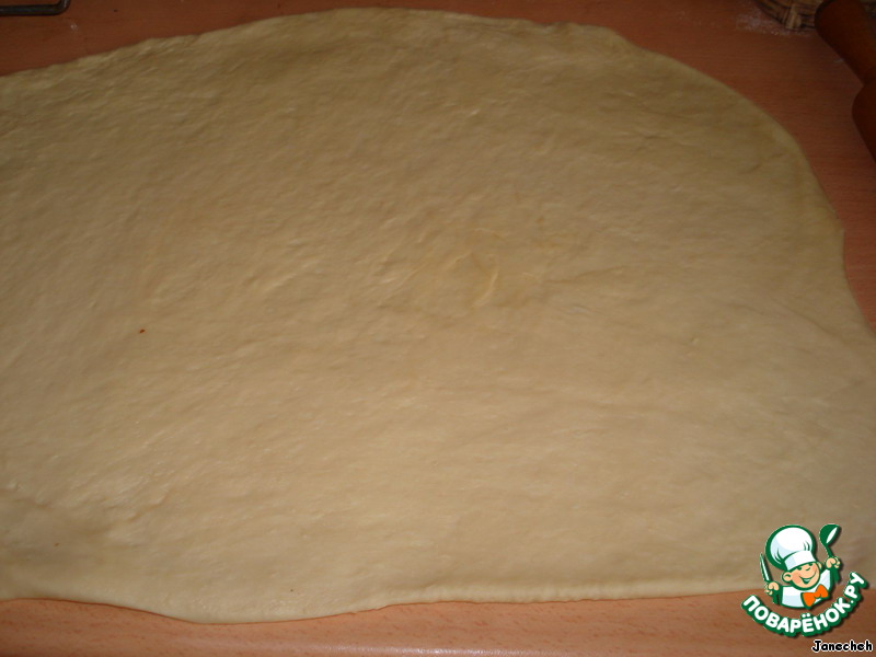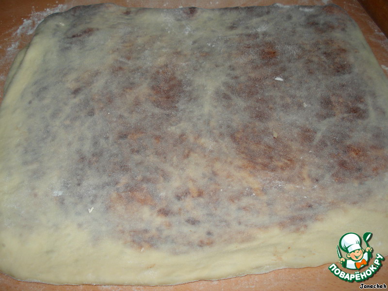 Посыпьте стол и тесто слегка мукой и раскатайте в прямоугольник.