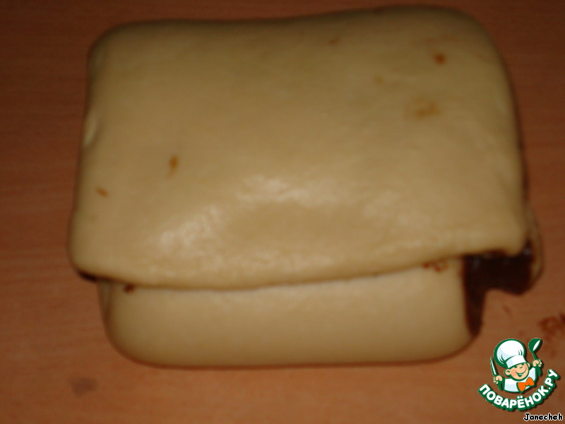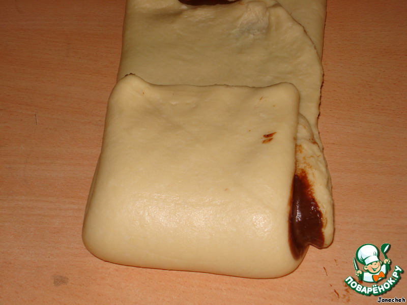 Намажьте шоколадную начинку на 2/3 тесто. Сложите, как показано на рисунке.