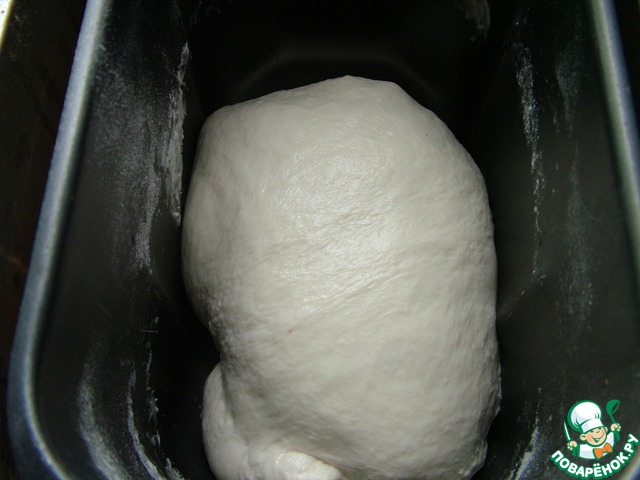Тесто: Вся опара, 440 г муки, 1 ч. л. соли, 2 ч. л. сахара, 1 ч. л. сухих дрожжей, 45 г сливочного масла, 22 г сухого молока, 280 г воды.