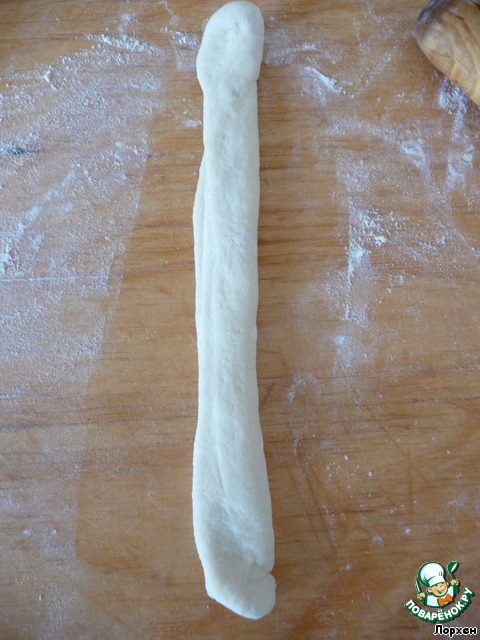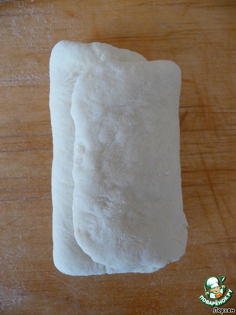 Берём кусок теста, посыпаем стол мукой и раскатываем тесто, придавая ему форму прямоугольника,