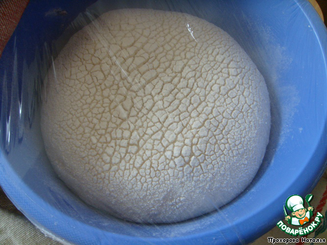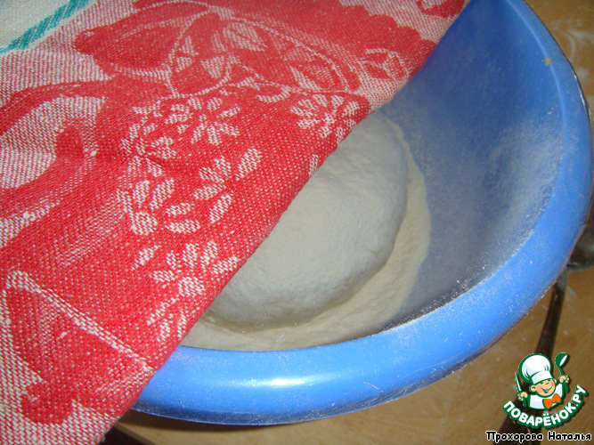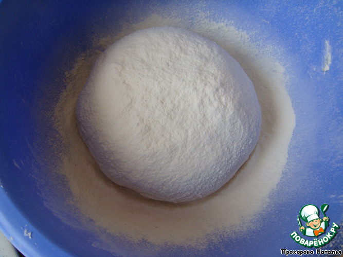 На стол всыпать 50 г муки. Тесто скатать в шар. Затем миску обильно посыпать мукой и положить туда тесто. И сверху посыпать оставшейся мукой...(имеются в виду те самые 50 г).