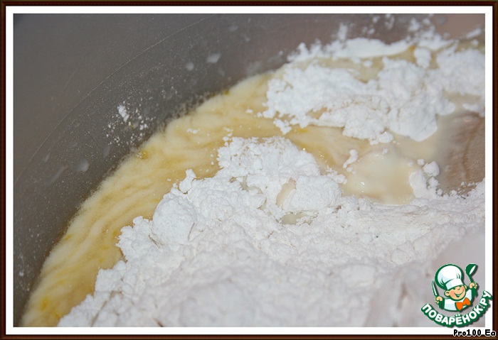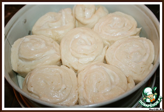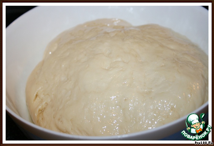 1. В большой миске растворить дрожжи в тёплой воде. Добавьте молоко, сахар, яйца, масло (растопить) - взбить миксером до однородности. Добавить 5 стаканов муки и взбить до однородности.
