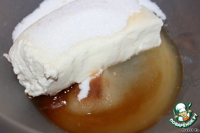 5. Начинка: соедините творог (у меня крем-чиз), сахар, апельсиновый сок и ваниль.