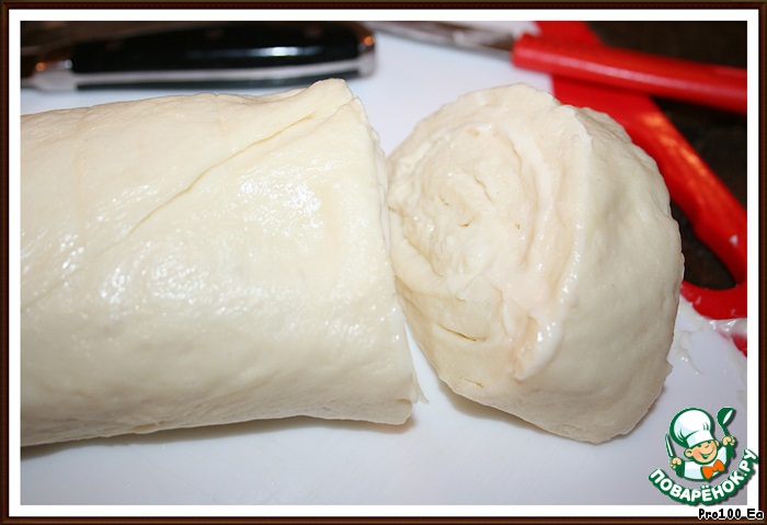 8. Разделить тесто на 2 части. Тесто раскатать в прямоугольник (45 см х 20 см - примерно).