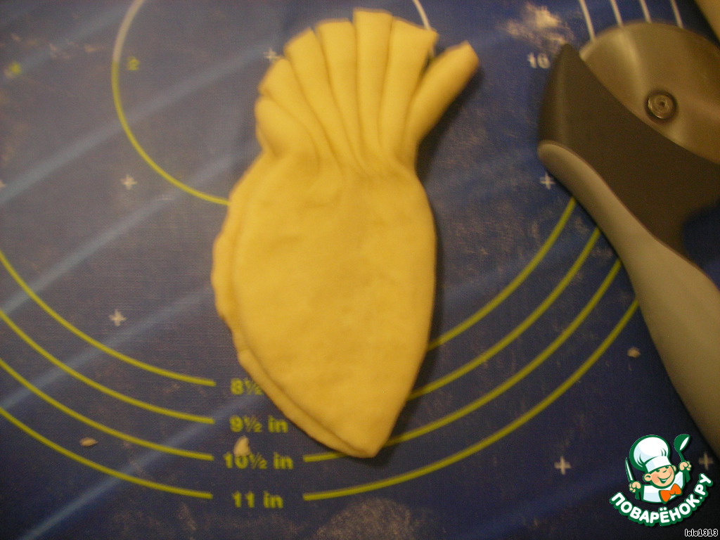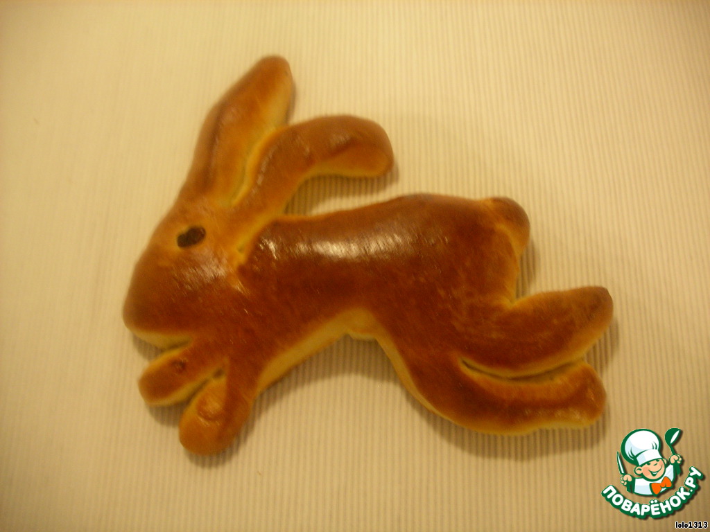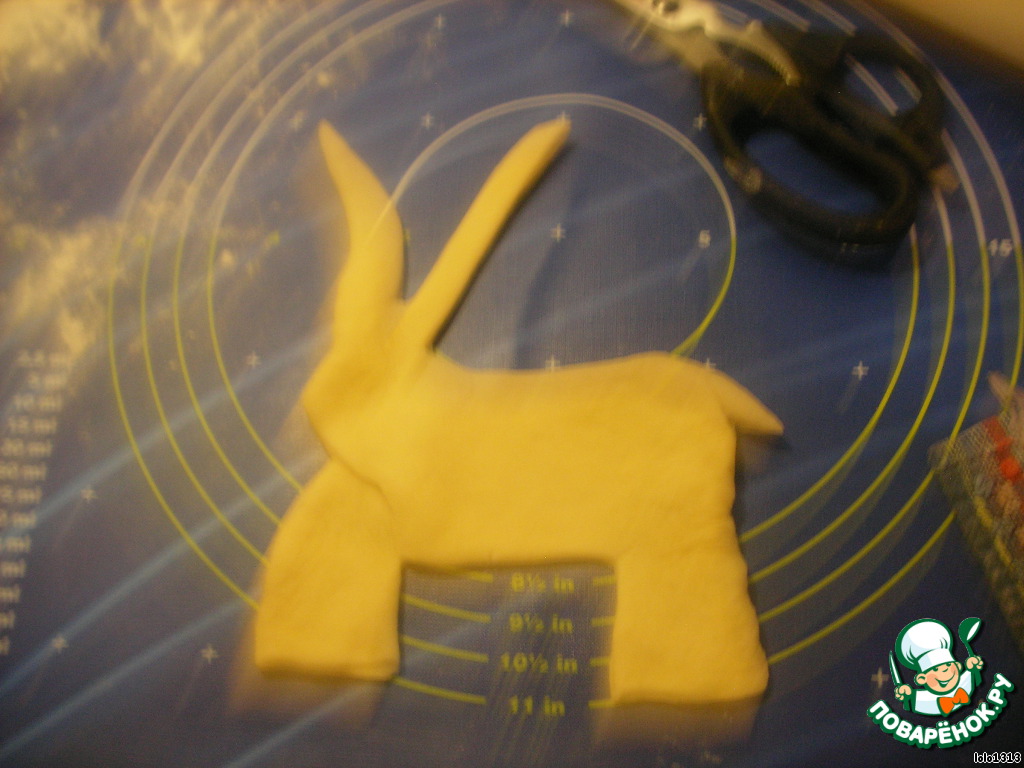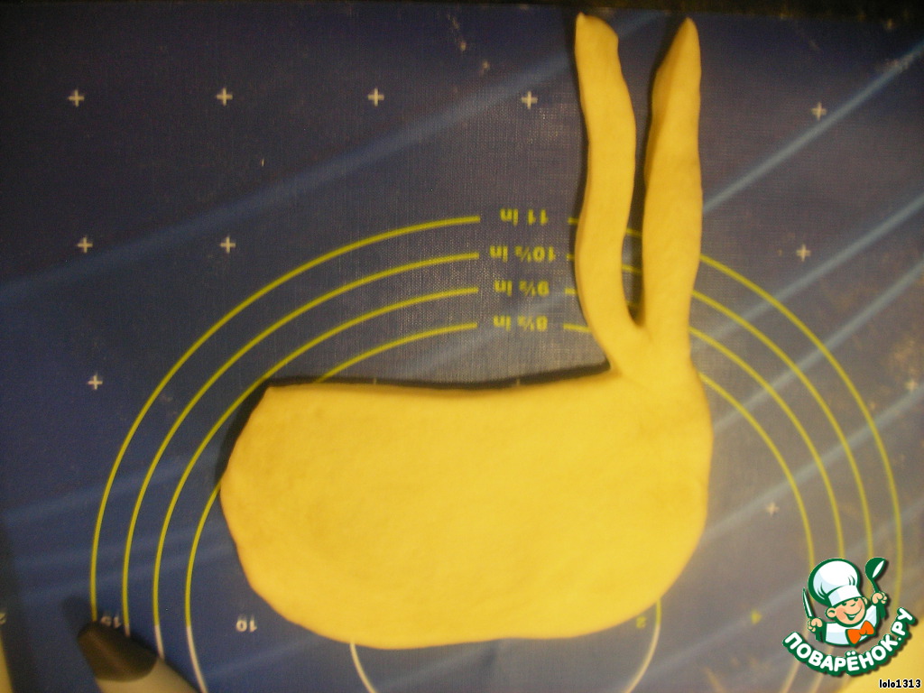 Сделать все соответствующие надрезы. Затем стягивать тесто таким образом, чтобы придать ему фигурку зайца. Подогнутая часть на картинке - это передние ножки, а две полоски подлиннее - это задние, надо эти полоски оттянуть назад, при этом может появиться излишек теста на спинке, его просто подвернуть под туловище, подрезать ничего не надо.