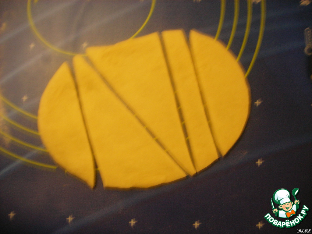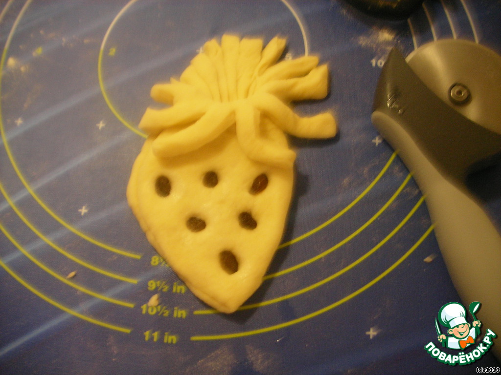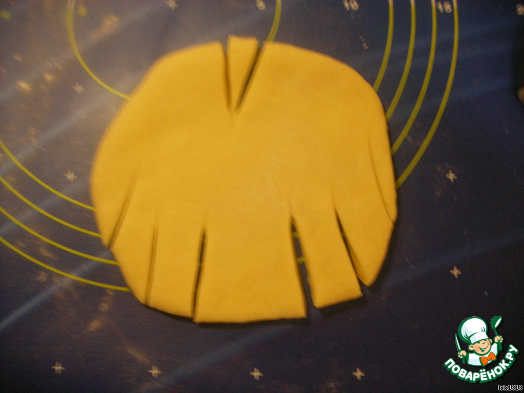 Для "клубнички" раскатанный пласт сложить вдвое (при желании можно положить и начинку), сделать при помощи кухонных ножниц надрезы и развернуть лепестки.