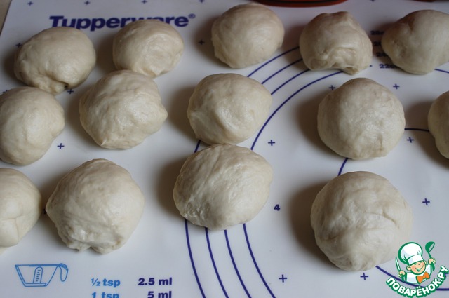 Тесто подошло. Разделим его на 15-16 частей. Сформуем колобочки и дадим минут 10-15 полежать им под полотенцем.
