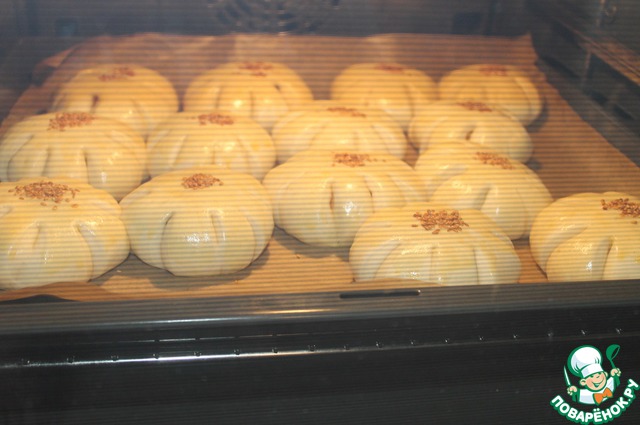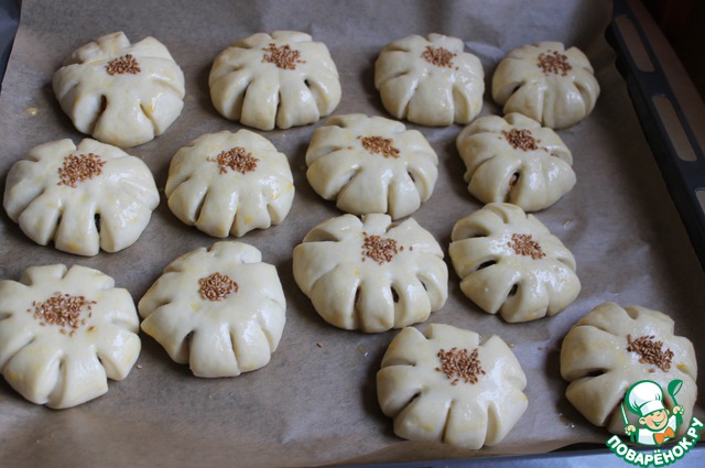 Когда они подымутся, смажем их яйцом взбитым и посыпем в середину кунжут.