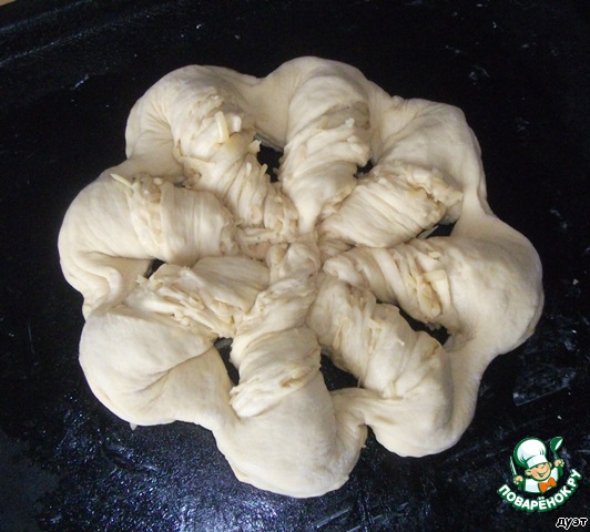 снова раскатываем пласт, накладываем на первый и снова обсыпаем сыром, повторяем ещё раз. Последний пласт накладываем и разрезаем тесто на 8 лучей.