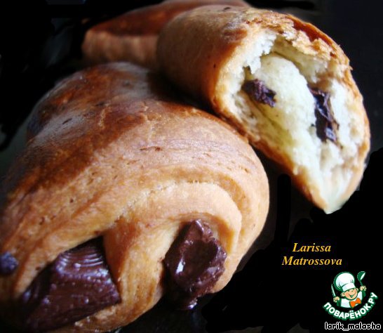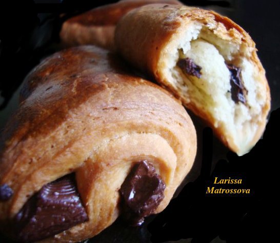 Во Франции есть отличные булочки, которые называются Pains au chocolat, что в переводе Хлеб с шоколадом. Но я не претендую на этот рецепт, просто позаимствовала форму подачи! Если решусь приготовить настоящие Pains au chocolat , то обязательно поделюсь с вами!