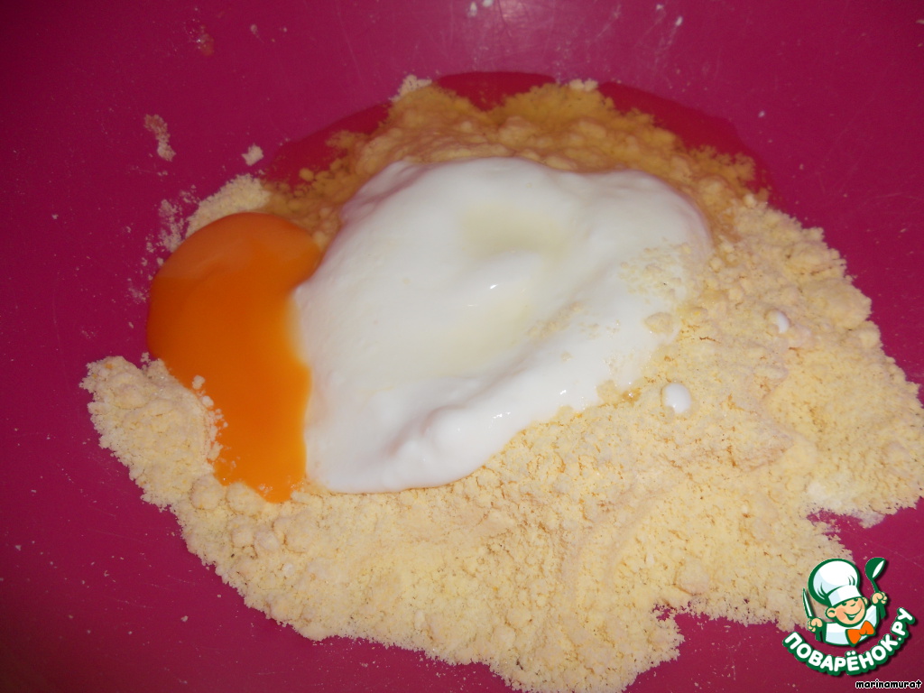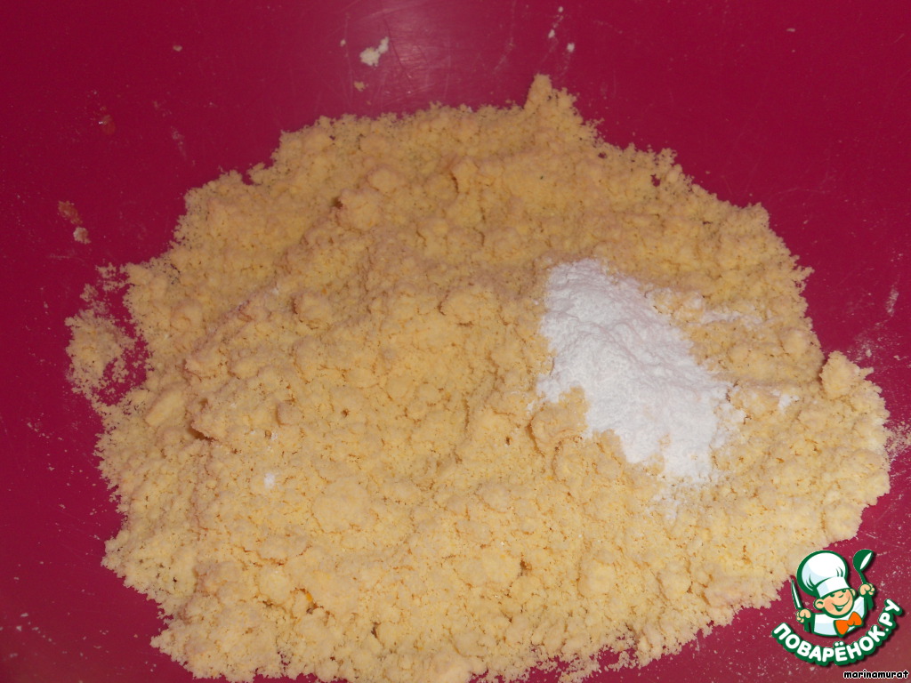 Разогреем духовку до 160-180 градусов (я все пеку на низких температурах, иначе горит, такая вот у меня интересная духовка; вы ориентируйтесь на свою духовку). В глубокой тарелке смешиваем руками до крошки просеянную муку и масло, которое предварительно порезали на кубики. Здесь мои небольшие изменения к рецепту. Часть муки я заменила на кукурузную, где-то 70 гр. Вы, если хотите, заменяйте, либо оставляйте оригинальный рецепт - белая мука высшего сорта. Добавляем разрыхлитель.