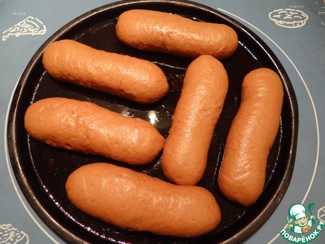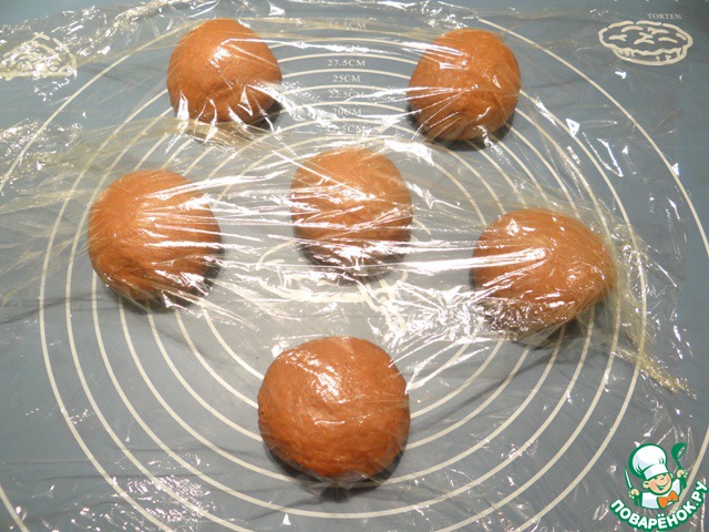 Противень смазываем растительным маслом, перекладываем на него булочки, отступая друг от друга, т. к. булочки сильно увеличатся в объеме. Накрываем их пленкой и даем увеличиться в объеме в 2 раза.