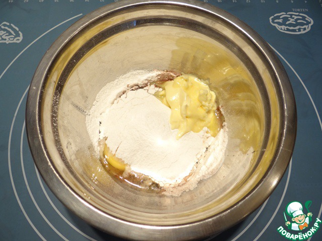 Затем добавляем просеянную муку и какао, 1/3 часть чуть взбитого яйца, размягченное сливочное масло, сухое молоко, сахар,