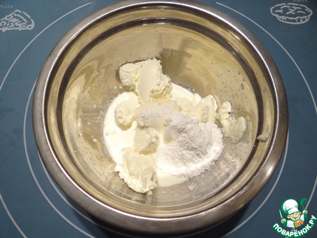 Охлажденные сливки, сахарную пудру и сливочный творожный сыр взбить миксером