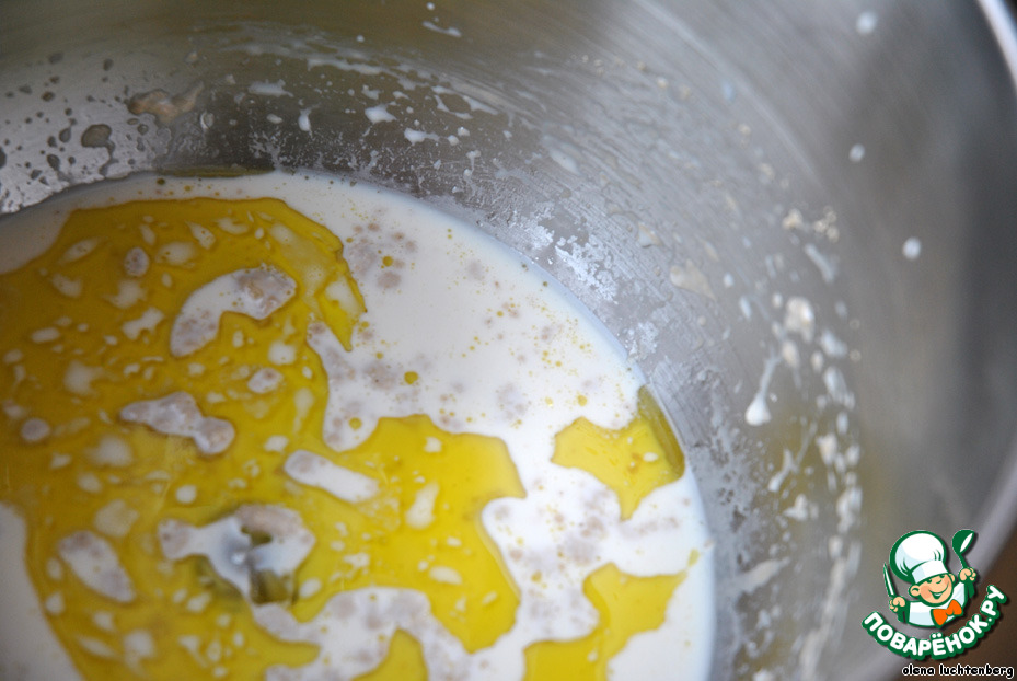 Теплую воду, сливки, сахар, соль, сухие дрожжи и растительное масло смешать до растворения сахара и соли.
