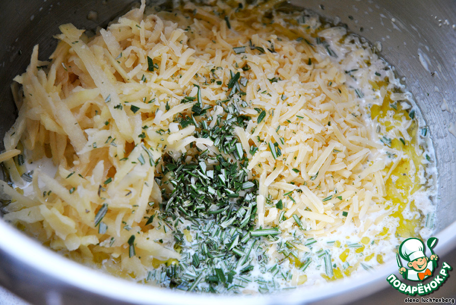 Картофель помыть и очистить, сыр и картофель натереть на крупной терке. Листики розмарина измельчить ножом. Если свежего розмарина нет, можно заменить чайной ложкой сухого. Сыр (отложите 1-2 ст.л.), картофель, розмарин и муку добавить к сливочной смеси и замесить очень мягкое, слегка липкое тесто. Накрыть чистым полотенцем и оставить в теплом месте на 15 минут.