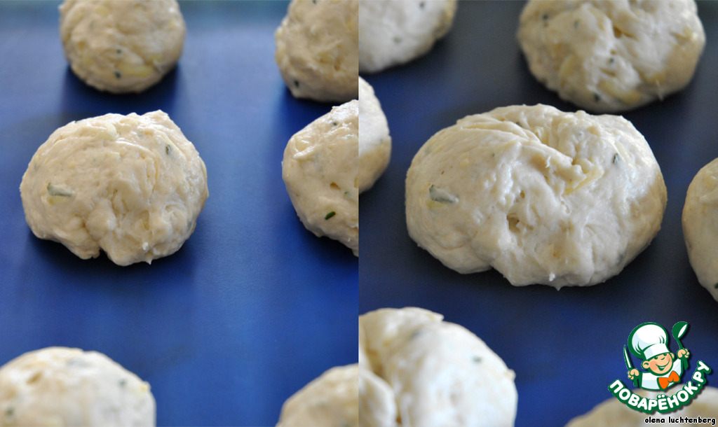 Сформировать булочки, у меня получается 12-14 штук. Накрыть пищевой пленкой и оставить подойти на 30-40 минут. Каждую булочку надрезать острым ножом и выпекать 10-15 минут в предварительно разогретой до 200 Ц духовке. Жар уменьшить до 180 градусов, булочки посыпать оставшимся сыром и выпекать еще 10 минут.