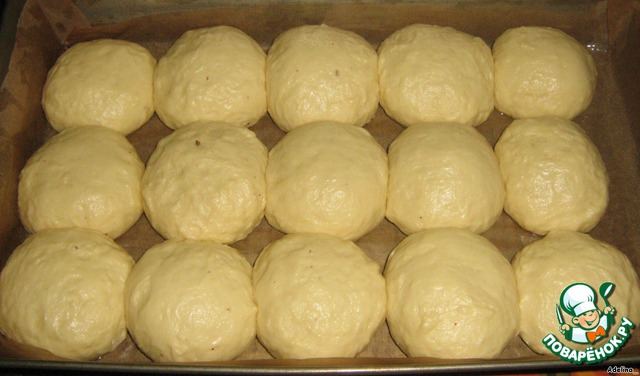 В просеянную муку (всю) влить подошедшие дрожжи, яичную смесь, растительное масло и перемешать. В процессе вымешивания, постепенно добавить растопленный маргарин или масло. Вымешивать тесто минут 20-25, поверьте, усилия стоят результата, получается очень гладкое, мягкое тесто с изумительным ароматом. Оставить тесто в теплом месте на час, потом обмять и оставить еще на час. Затем тесто ещё раз хорошенько помесить. Оно будет "пузырить" и "пищать" под руками. Сформовать булочки, выложить на противень и дать подняться (минут 8-10).