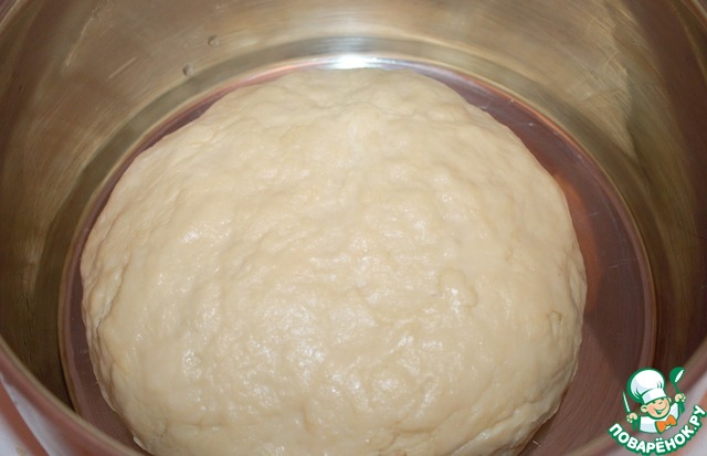 Соединяем опару с яйцами и сливочным маслом. Перемешиваем. В просеянную муку добавляем ванилин и постепенно вводим в смесь. Замешиваем тесто, мешаем не долго, мукой не забиваем. Для удобства руки смазываем растительным маслом. Оставляем для поднятия на 1, 5 часа.