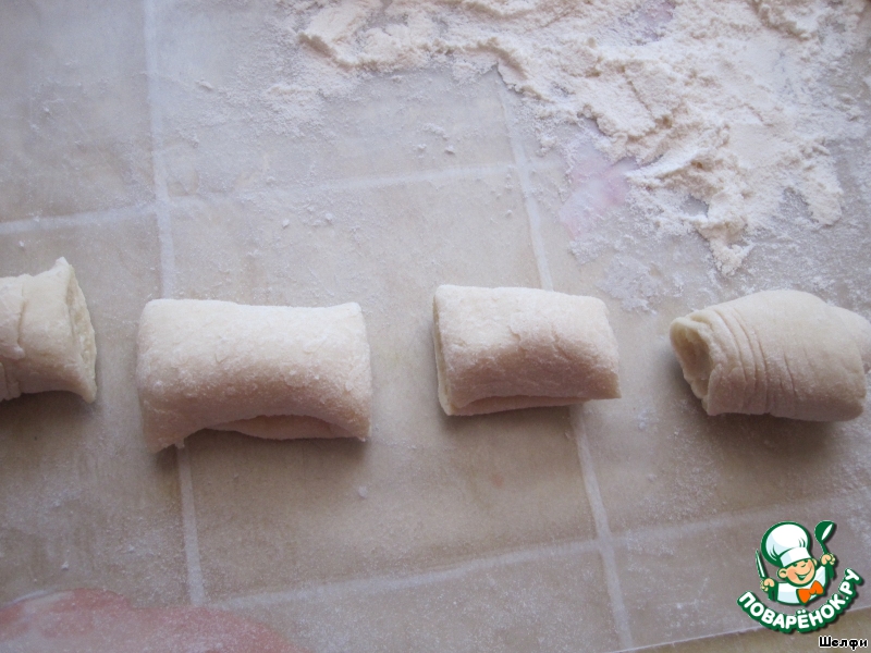 Так как у меня покупное тесто состояло из 8 щариков, то я не стала их объединять в один шар и сделала несколько маленьких пластов.
