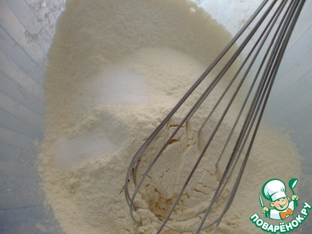 Просеять в большую миску муку, добавить соль -1,5 ч. л., перемешать.
