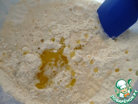 Добавить в муку вспененные дрожжи и оливковое масло (2 ст. л.).